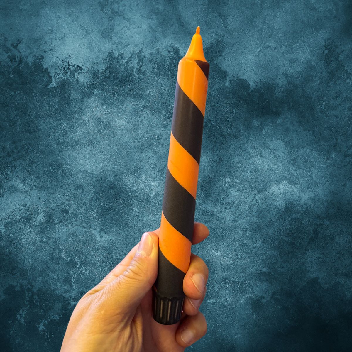 Spökskruv är ett handdoppat halloweenljus i klassisk svart och orange spiral. Perfekt för dukningen på halloweenfesten, höstmyset eller för dig som älskar när inredningen får lite mer attityd.