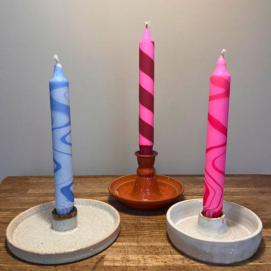 Våra färgade stearinljus tillverkas för hand i vår verkstad i Gränna av 100 % stearin.